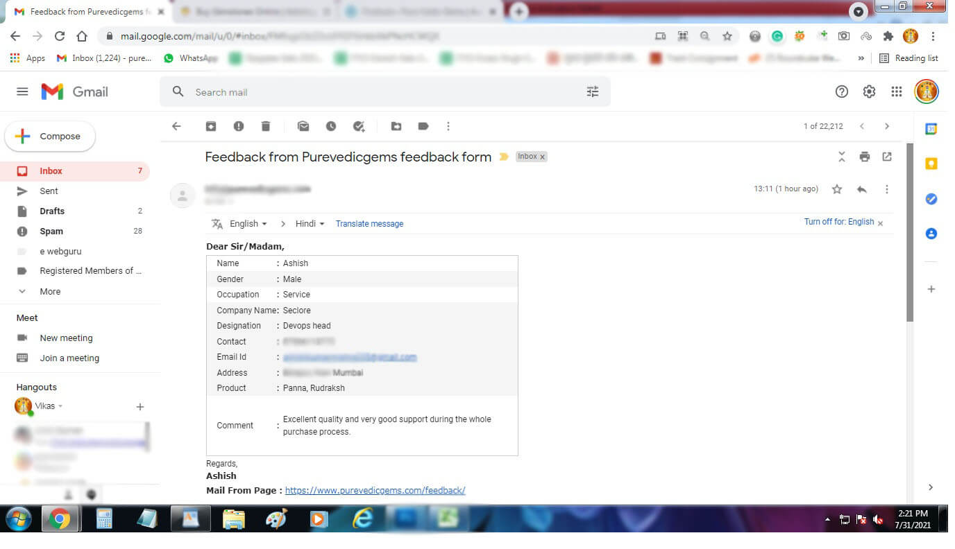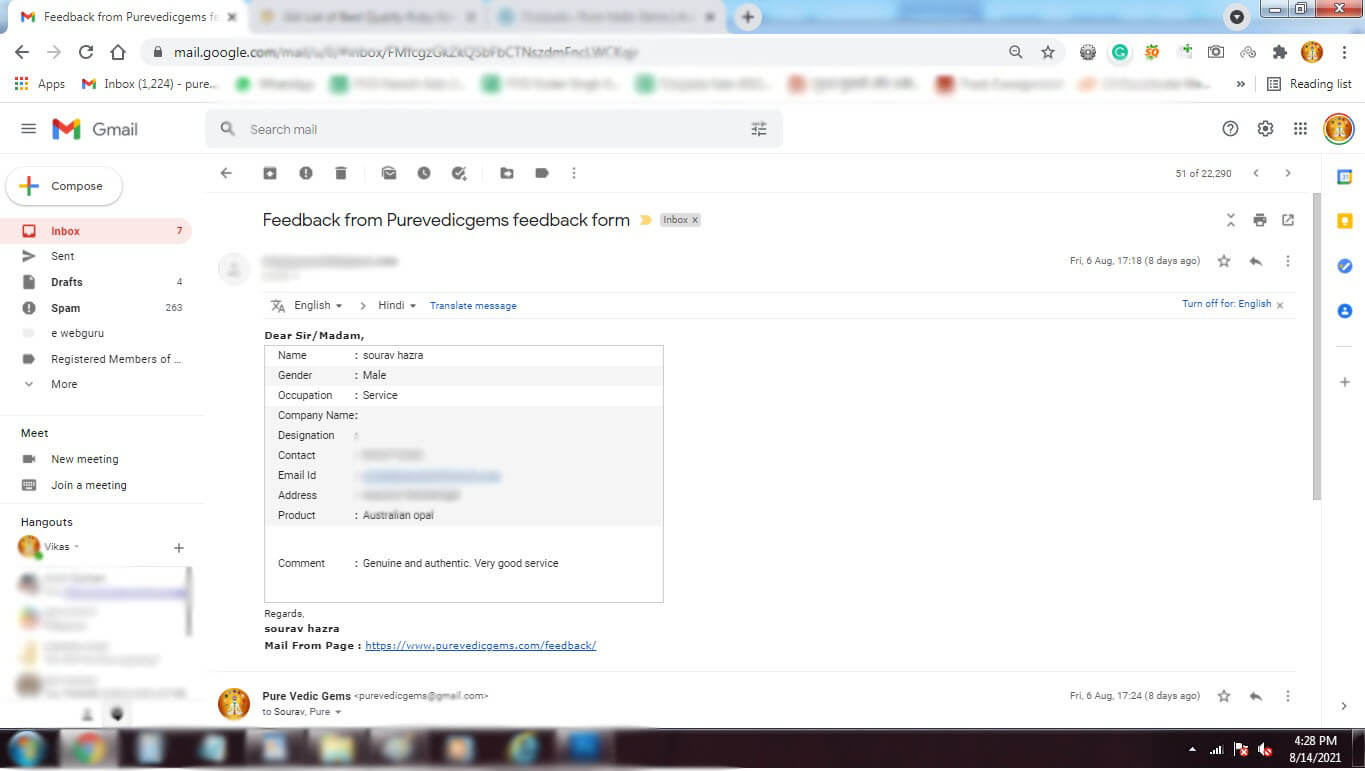 Hi Vikasji, Its my pleasure to write feedback about the interaction that we had. I am very impress with the quality of the gemstone, reasonable pricing, finishing and perfection with with it is embedded into ring. The overall services such as - day to day interaction , resolving queries with quick responses and delivery on time in secure packing. I had received excellent customer service for first purchase of a another gemstone last year, the same experience this time as well. I would continue to use Purevedic for future purchases and would highly recommend to others.
