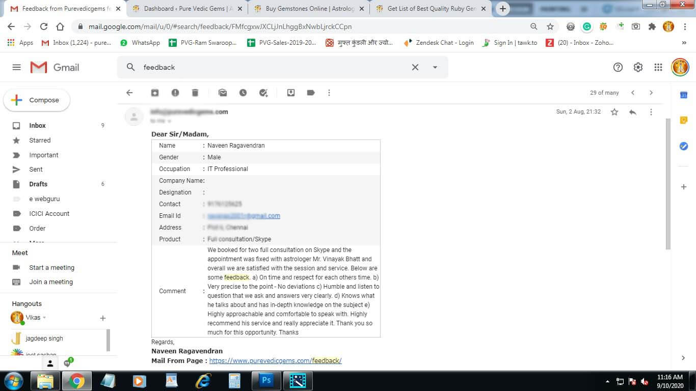 Hi Vikasji, Its my pleasure to write feedback about the interaction that we had. I am very impress with the quality of the gemstone, reasonable pricing, finishing and perfection with with it is embedded into ring. The overall services such as - day to day interaction , resolving queries with quick responses and delivery on time in secure packing. I had received excellent customer service for first purchase of a another gemstone last year, the same experience this time as well. I would continue to use Purevedic for future purchases and would highly recommend to others.