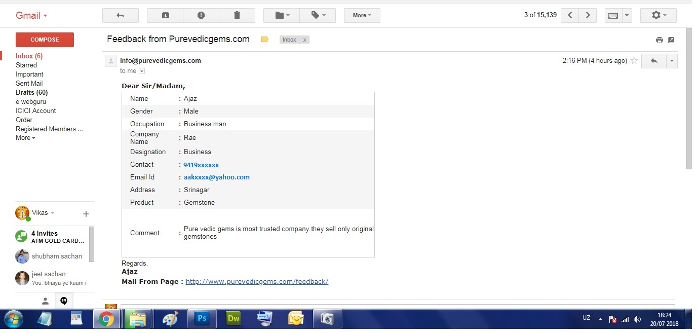 Hare Krishna All I bought two gem stones from Pure Vedic Gems. I was bit confused about gem stones because it was my first time experience. I cruised around many websites and made phone calls in India, but didn\'t get any satisfactory answers. I contacted Pure Vedic Gems, they followed up my quiries nicely. Vikas ji the owner of Vedic Gems gave me very valuable advices. It took me long time to finalize the products, but staff had lots of patience. Pure Vedic Gems team answered all my questions and helped me to select the products. They helped me on every step of this process. I will highly recommend Pure Vedic Gems to any customers especially Overseas Clients, because it is very hard to find right place to buy gems with complete package (including rings). They have given certificates of Gems and done the proper puja process too. And one more thing to mention, they have Astrologer Team which can help you out if you are not sure of right gem for you on very nominal charges. Full marks to Vikas Mehra ji and his team. Thanks a million Regards Baljit Bains