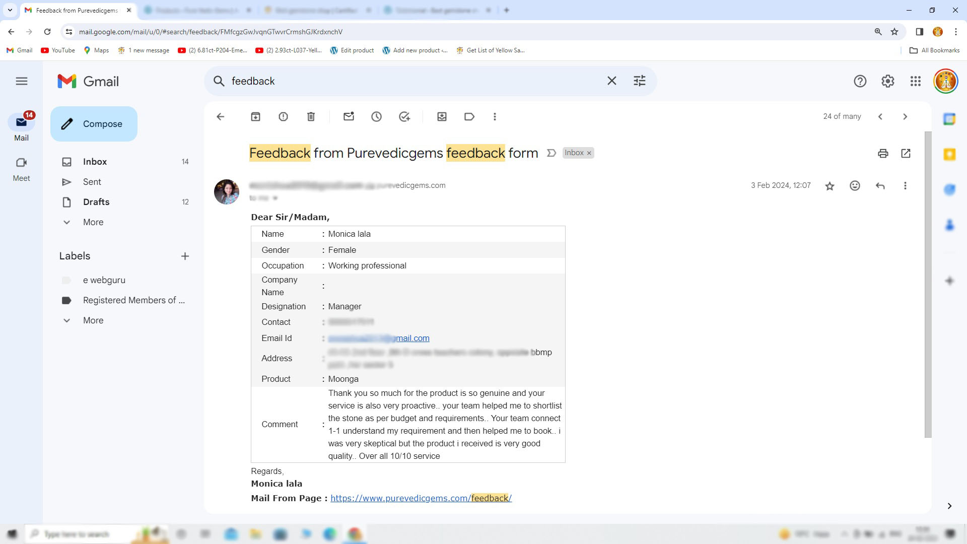 Hi Vikasji, Its my pleasure to write feedback about the interaction that we had. I am very impress with the quality of the gemstone, reasonable pricing, finishing and perfection with with it is embedded into ring. The overall services such as - day to day interaction , resolving queries with quick responses and delivery on time in secure packing. I had received excellent customer service for first purchase of a another gemstone last year, the same experience this time as well. I would continue to use Purevedic for future purchases and would highly recommend to others.